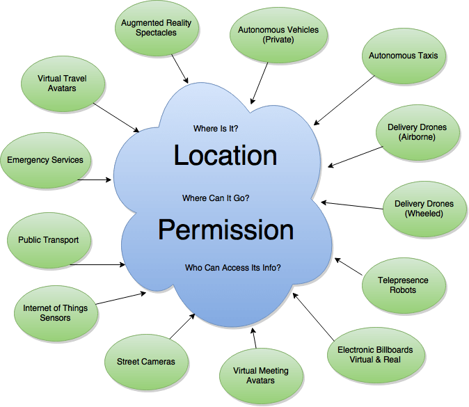 Permissions are granted by property owners, as to who can visit them in the real world (robots/drones) and people who arrive virtually. Camera owners will share their imagery with whoever they choose, in circumstances they dictate – for example the police can only have access in an emergency or if a crime is committed.